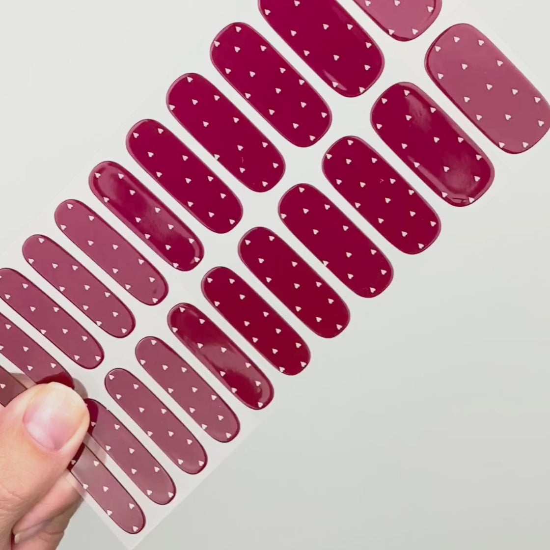 „Dainty Little Love“ ist Bestandteil der UV Gel Kollektion. Diese niedliche Kreation zeigt zarte Herzen, die kunstvoll auf einem dunkelroten Untergrund gestaltet sind. Es sieht auf jedem Hautton toll aus und passt zu nahezu jedem Anlass.